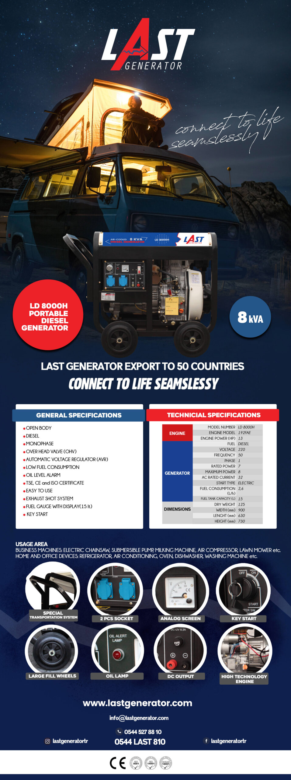 LD 8000H DIESEL GENERATOR Usage Area Business Machines: Electric Chainsaw, Submersible Pump, Milking Machıne, Air Compressor, Lawn Mower etc. Home and office devices: Refrigerator, Air Conditioning, Oven, Dishwasher, Washing Machine. Etc. Description Description Diesel Last Generator Portable Generator Related products Diesel GeneratorsLPS SeriesLPS 300 Diesel Generator Read more Diesel GeneratorsLPS SeriesLPS 200 Diesel Generator Read more Diesel GeneratorsLPS SeriesLPS 110 Diesel Generator Read more