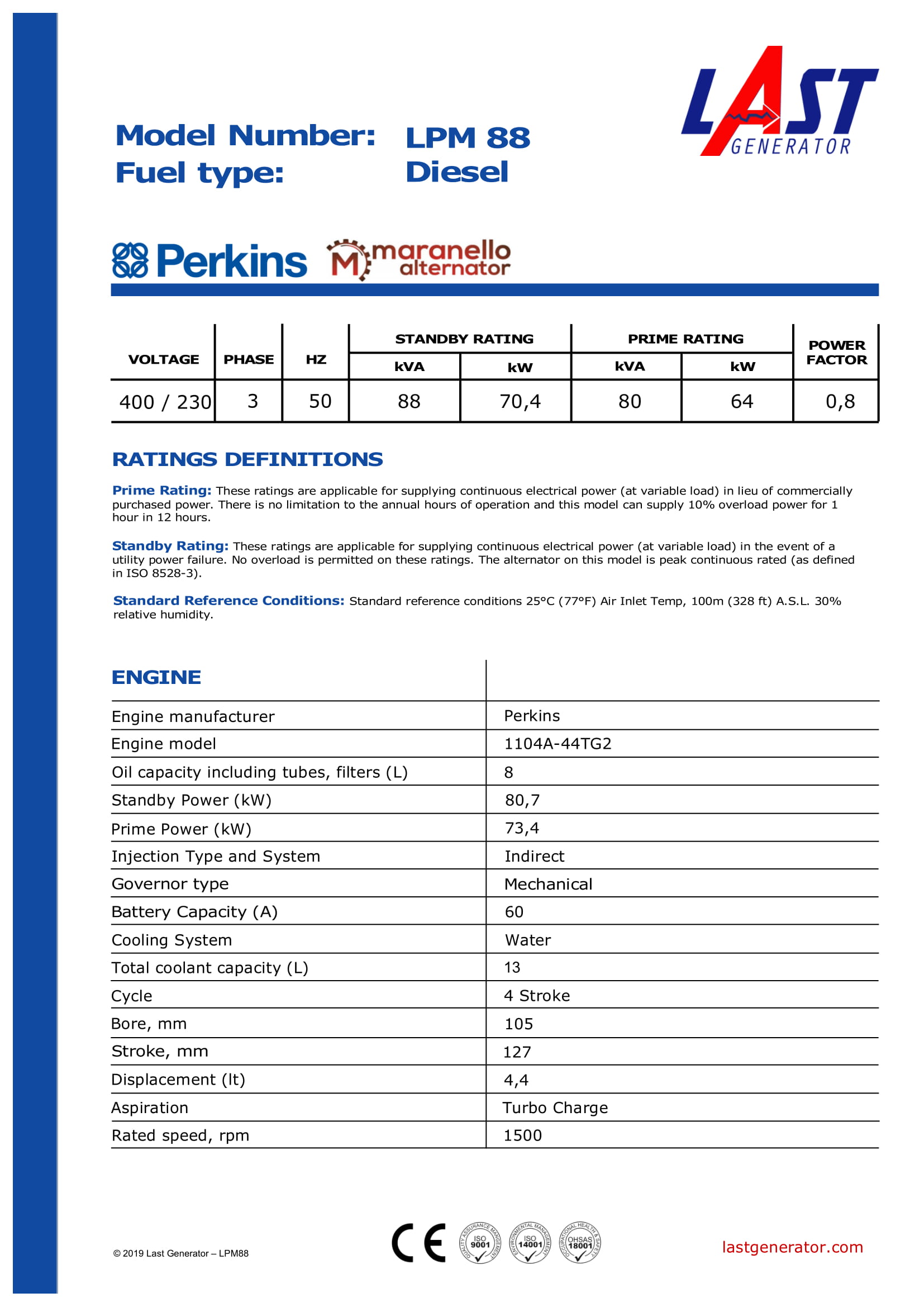 Prime Rating: These ratings are applicable for supplying continuous electrical power (at variable load) in lieu of commercially purchased power. There is no limitation to the annual hours of operation and this model can supply 10% overload power for 1 hour in 12 hours.